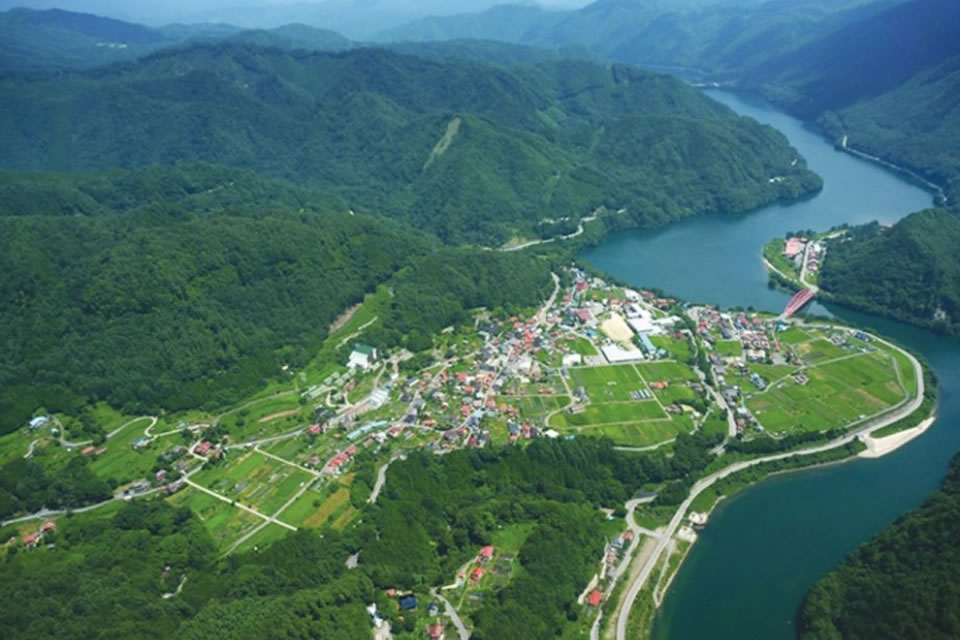 「おんたけ(御岳)湖」は、1961年に愛知用水の水源(牧尾ダム)として誕生し、以来半世紀にわたり王滝村の人々の暮らしを見守ってきました。その貯水量は名古屋ドーム55杯分になり、王滝村の豊かな水資源を濃尾平野の東部から知多半島まで引き、愛知県・岐阜県の27市町の田畑(約15,000ha)を潤しています。