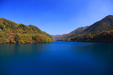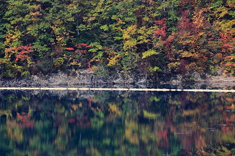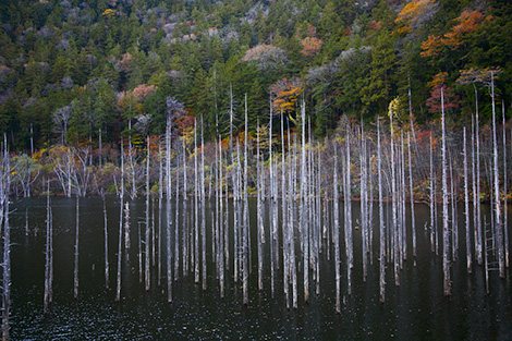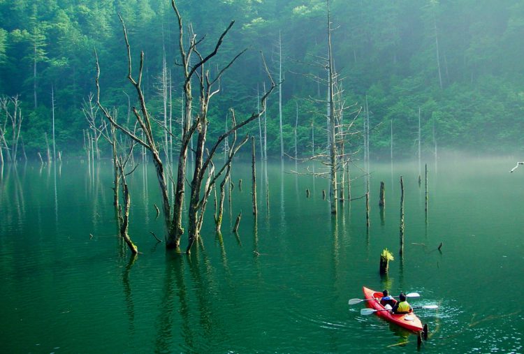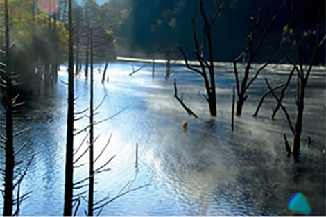 そして一方の「自然湖」は、1984年の「長野県西部地震」によって王滝川の流れがせき止められて生まれた天然湖で、静かな湖面に立ち木が屹立し神秘的な情景を見せています。深い森と清流、湖面の立ち枯れの木々、湖畔の断崖の風情を、自然湖ネイチャーカヌーツアー で楽しめたり、四季を通じて写真撮影のスポットとして多くの人が訪れています。