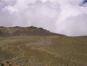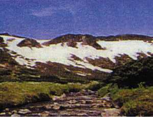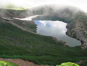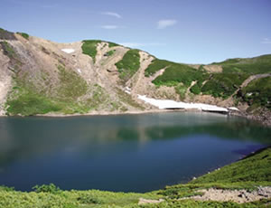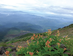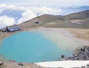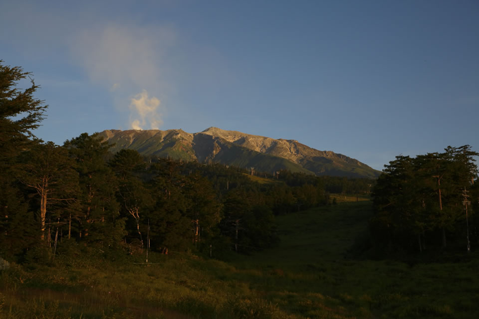 山頂には、南北に一ノ池から五ノ池までの噴火口跡が一列に並び、長い裾野を形成する火山造山の顕著な地形を見ることができます。ことに三ノ池や四ノ池、八合目付近からは、雪解けとともに高山植物の美しいお花畑が見られ、山腹から裾野にかけては深い原生の森や木曽ヒノキの美林でおおわれ、荘厳な山容を誇っています。
