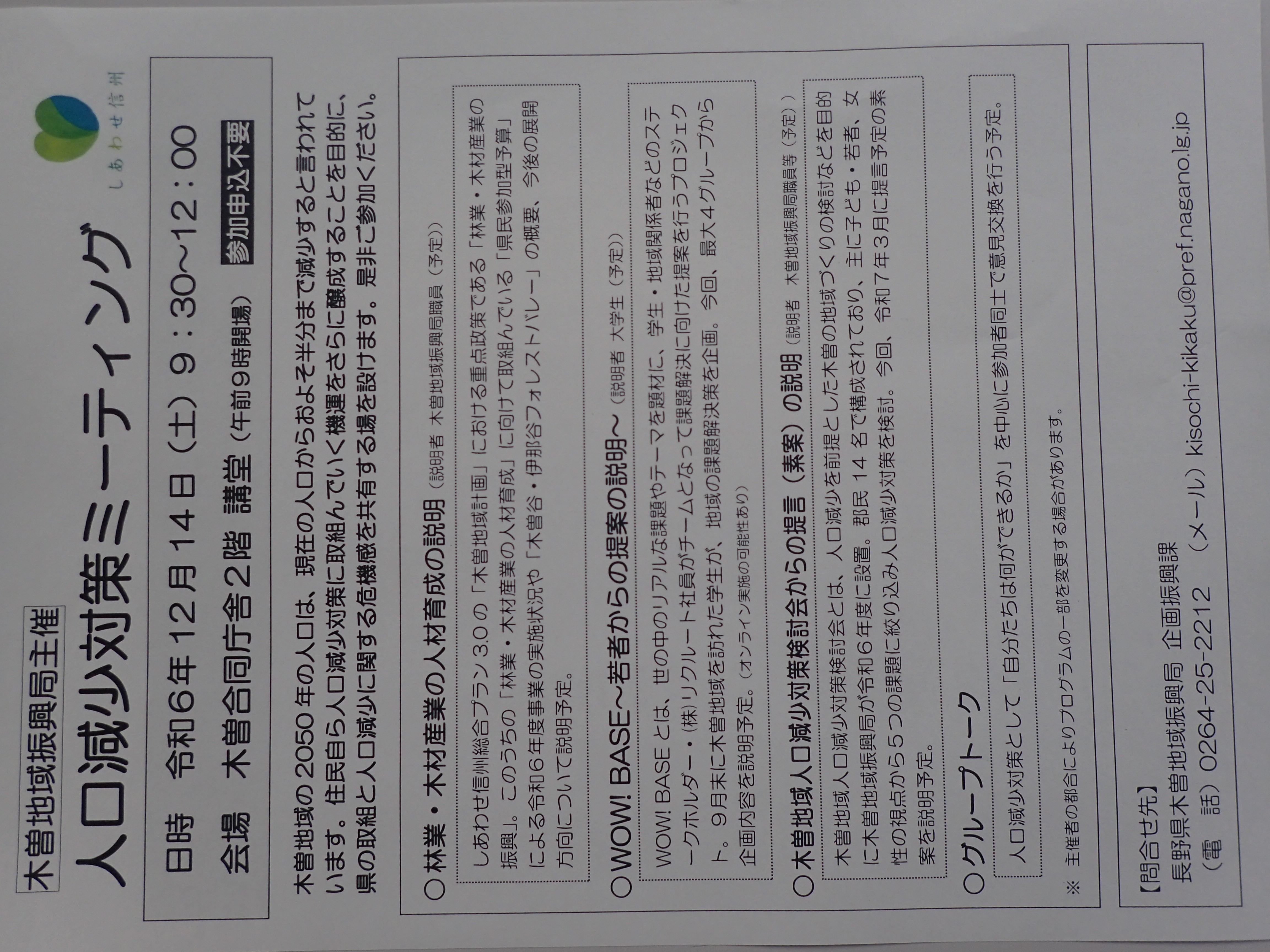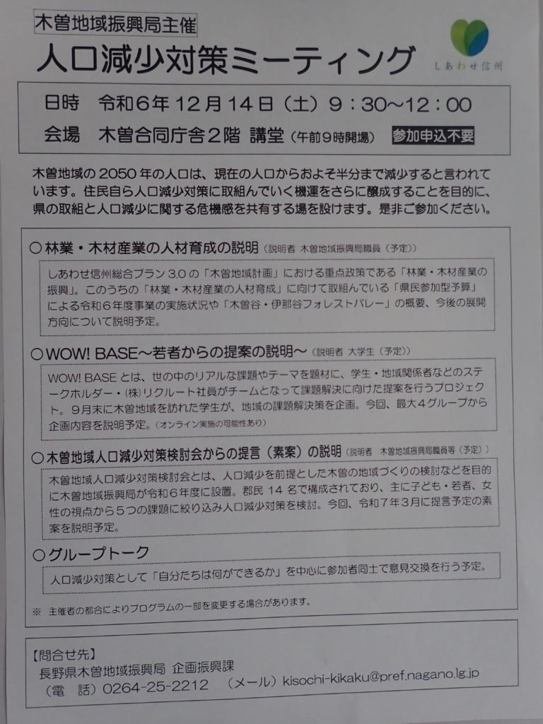 木曽地域振興局主催の「人口減少対策ミーティング」が開催されます。