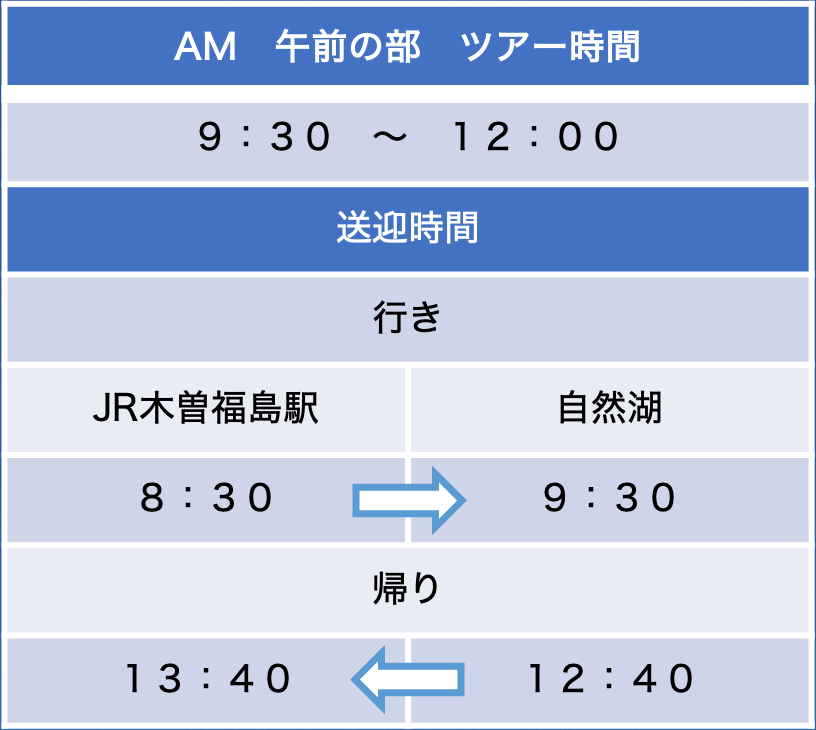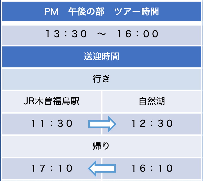 公共交通機関で木曽へ訪れ、自然湖ネイチャーカヌーツアーにご参加されるお客様対象に、無料送迎を行います(予定)。