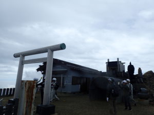 王滝頂上避難施設と御嶽山監視員の正沢さん。