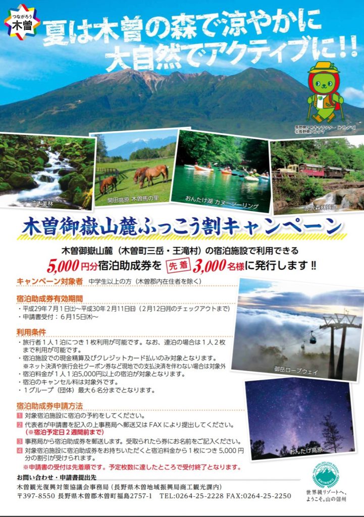 木曽御嶽山麓ふっこう割キャンペーンのお知らせ! 2017.06.19