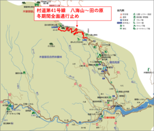 村道第41号線(八海山から田の原間)は、令和元年11月6日(水)から冬期間全面通行止になります。