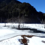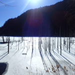 雪の湖面に立ち枯れの木々が陰を落とす景色が静寂の中に広がっていました。