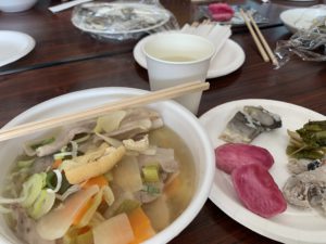 [豚汁をはじめ、万年寿司、赤カブ漬け、すんき、王滝なますといった王滝ならではの食を楽しみました。]
