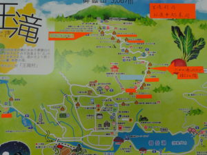 既存の村内マップにお食事処をオレンジ色の目印をつけてみました。