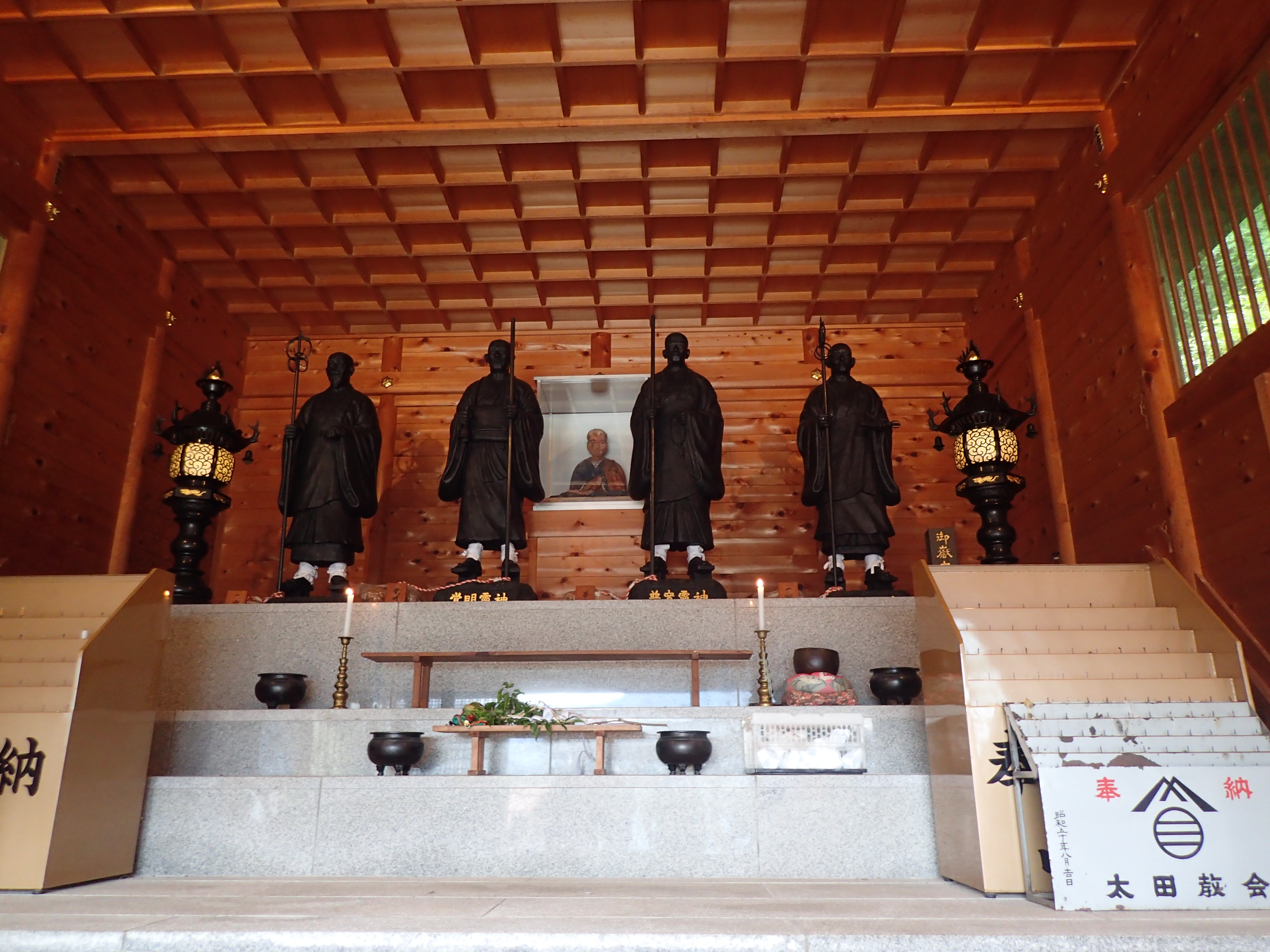 社殿中央には普寛行者の生前に造られたという木造座像が安置されています。その前には中興開祖覚明行者と普寛行者、及び一心行者と一行行者の銅像が祀られています。