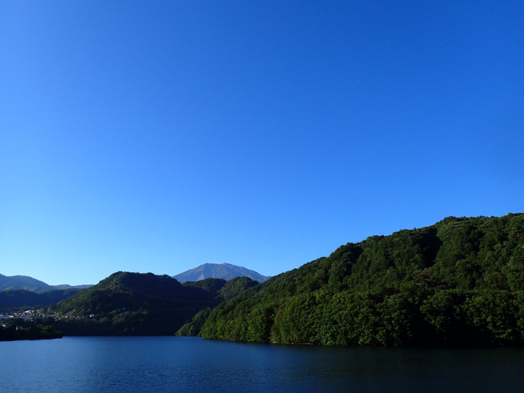 御嶽山を望める御岳湖 紅葉が始まりつつある周辺の山々 桜の紅葉の美しい松原スポーツ公園