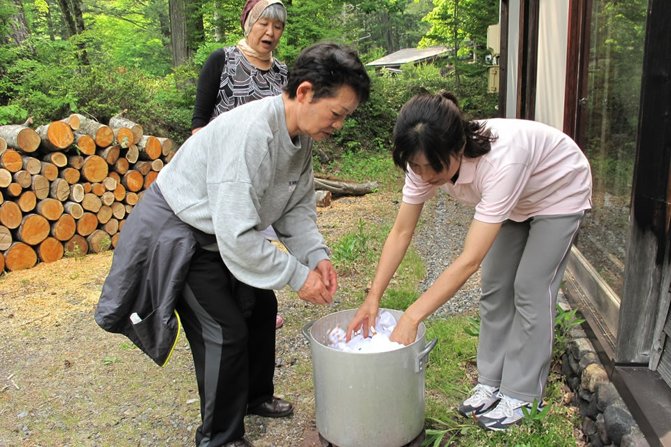 「王滝村の草木染」を起こした“ぷち工房CHIEKO”では毎年、子供たちやお年寄りの皆様と一緒に、タマネギの皮や身近な野菜を使った草木染など、自分たちの手で植物を採取し、煮出し、染め上げていく「体験染め」を行っています。